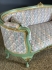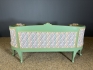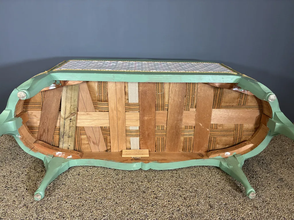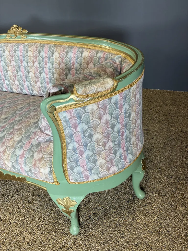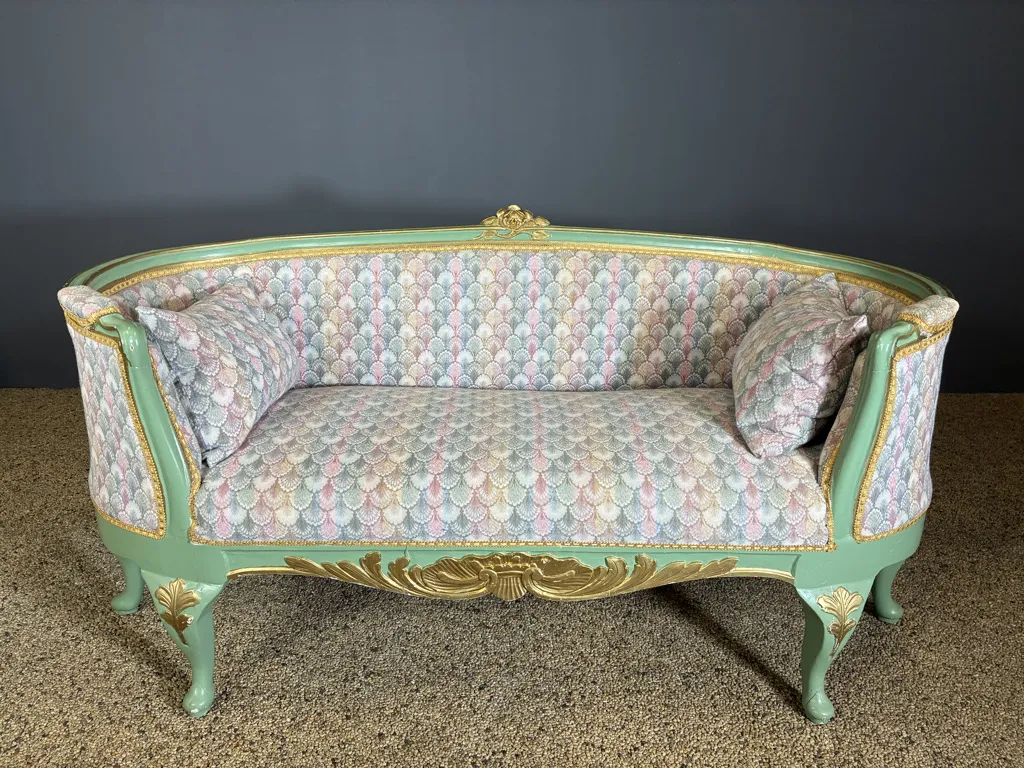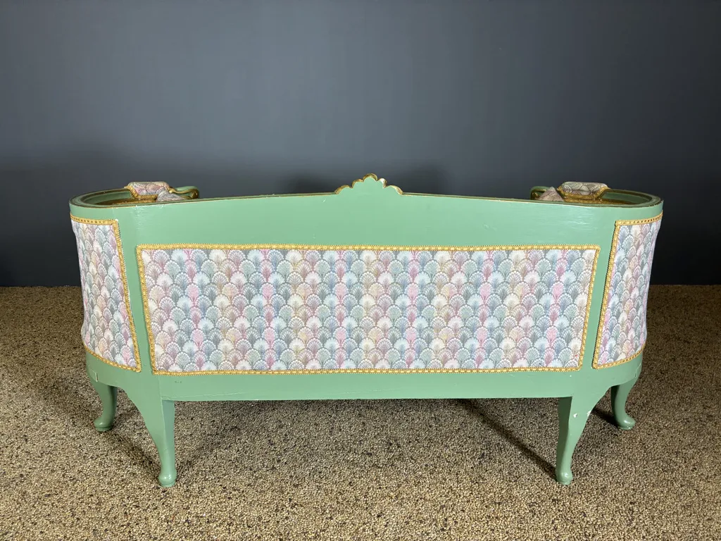 Grönmålad med guldmålade detaljer. Bruksslitage och färgbortfall. Längd:170cm, Djup:63cm, Rygghöjd:90cm