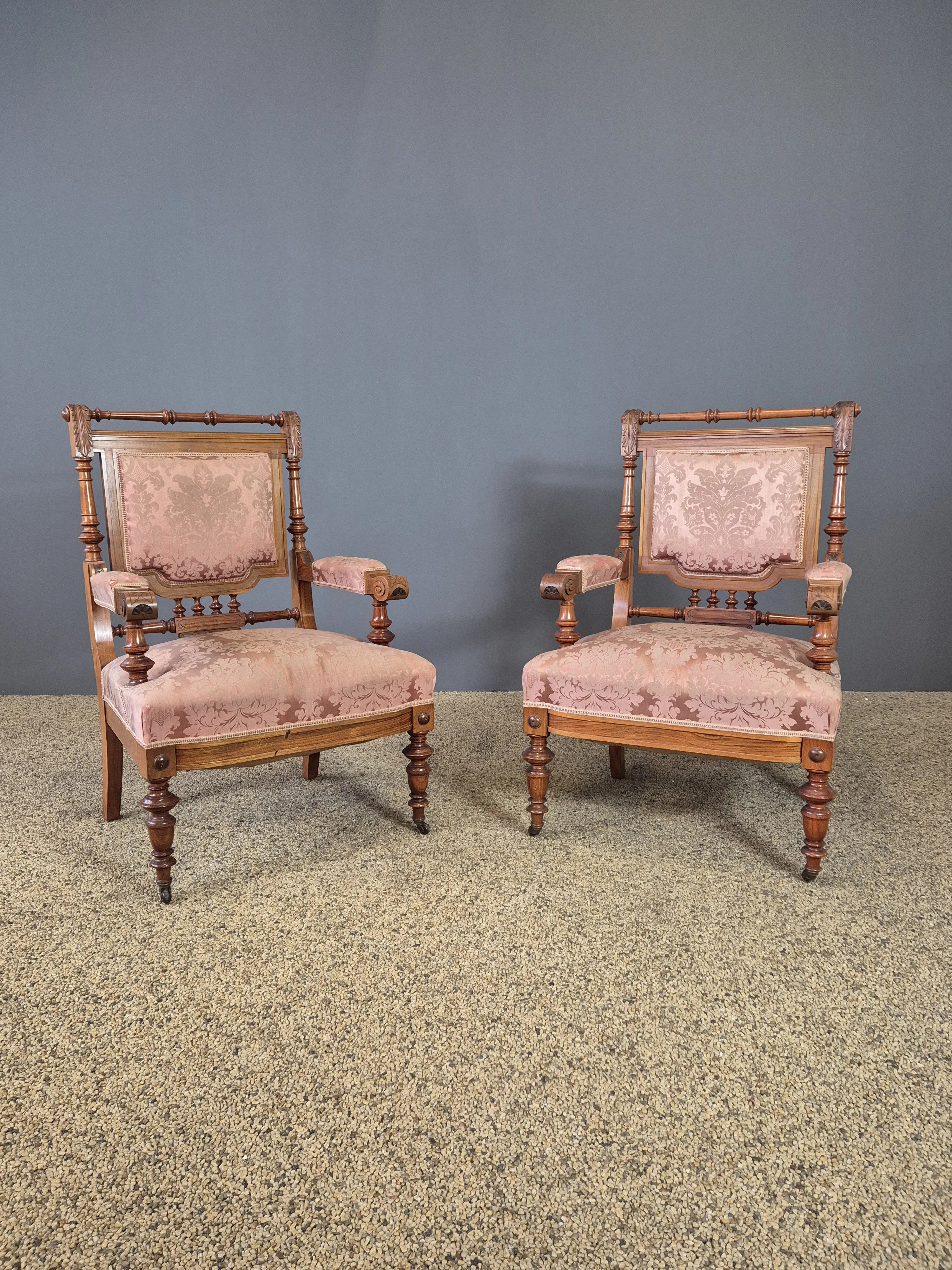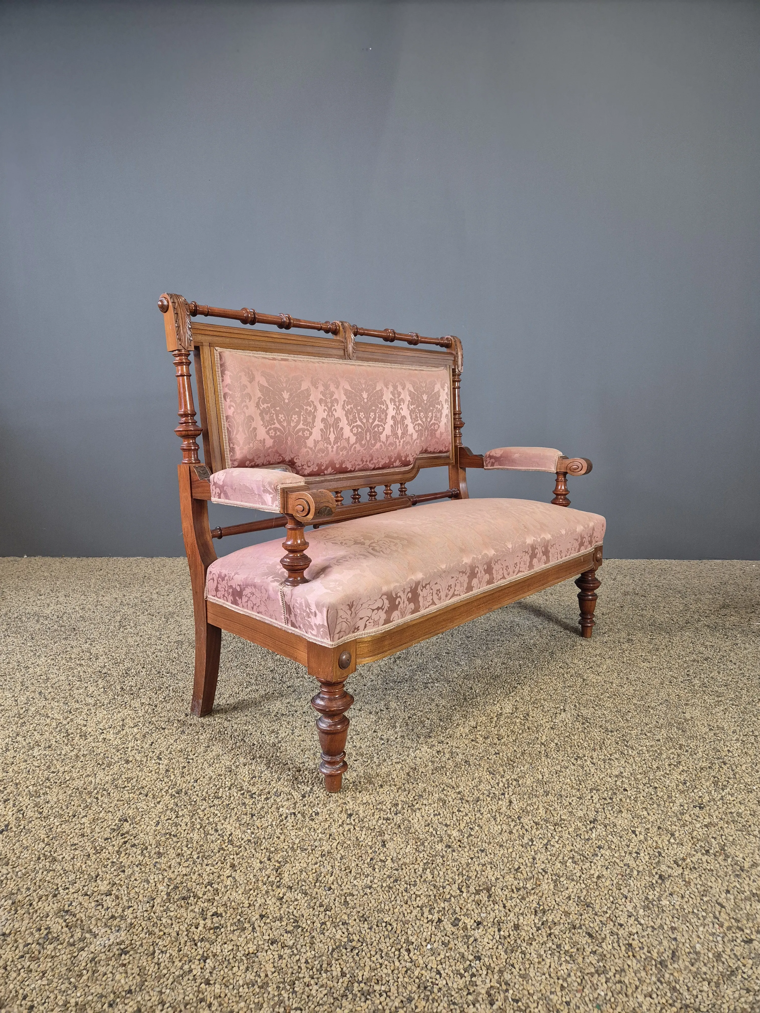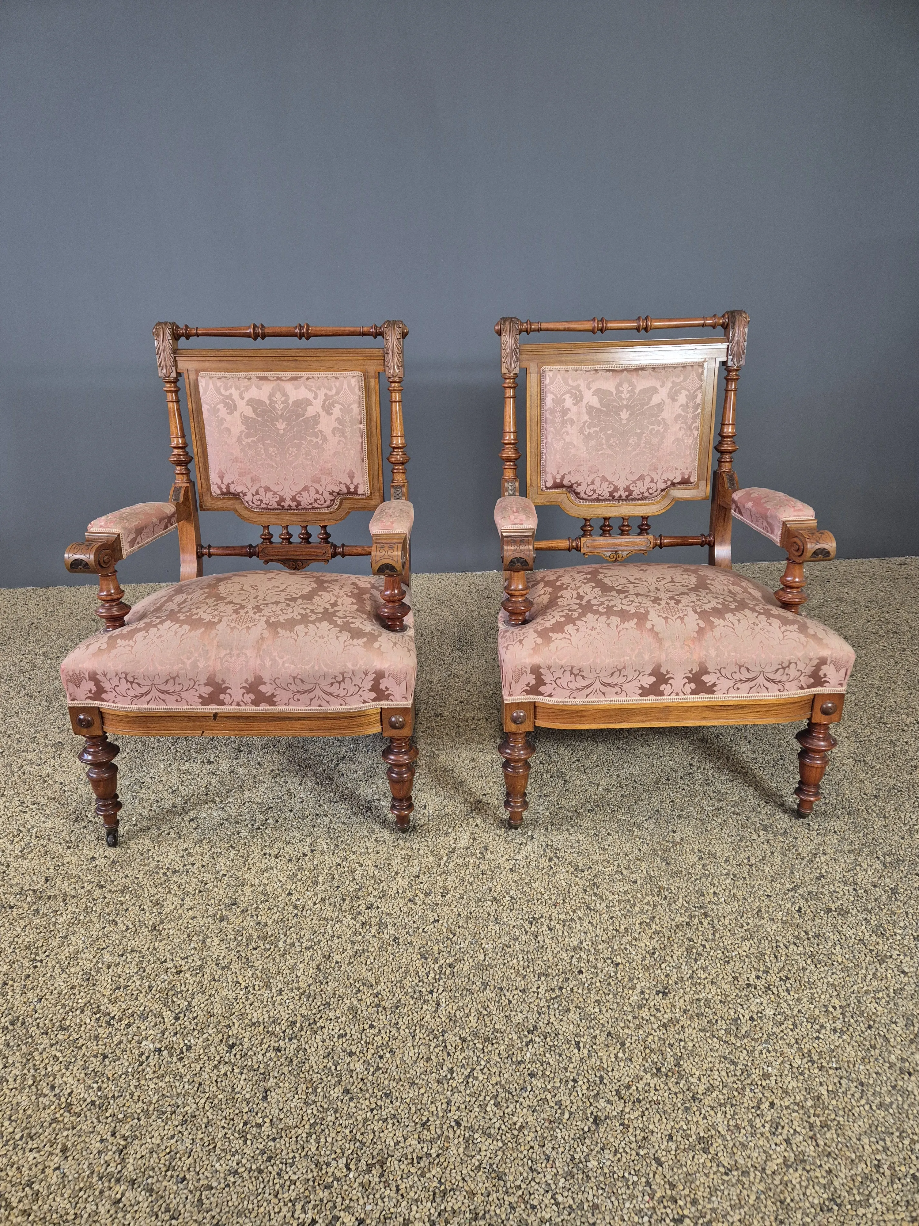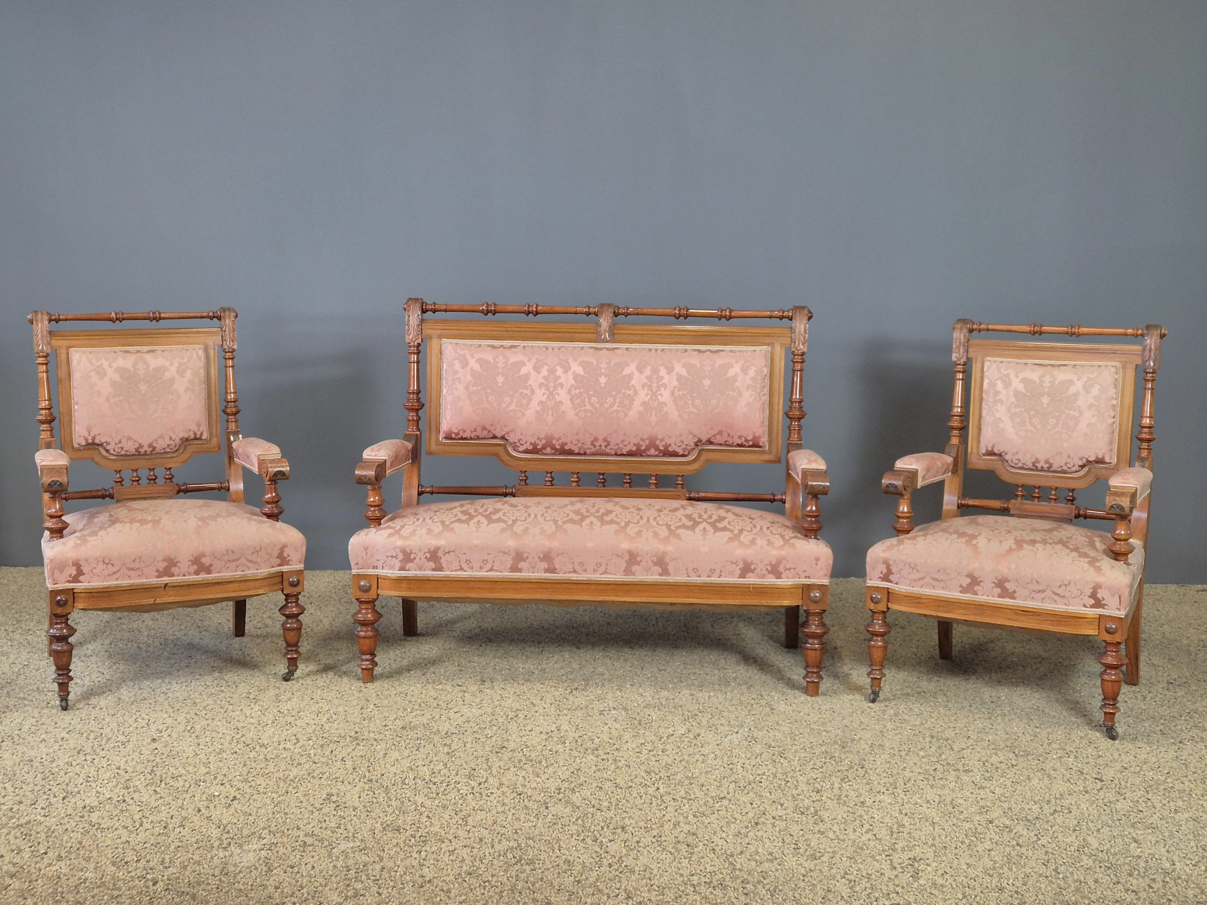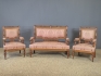 Nyrenässans-stil med klädd soffa (bredd: ca140cm) och paret stolar. Bruksslitage och skador.