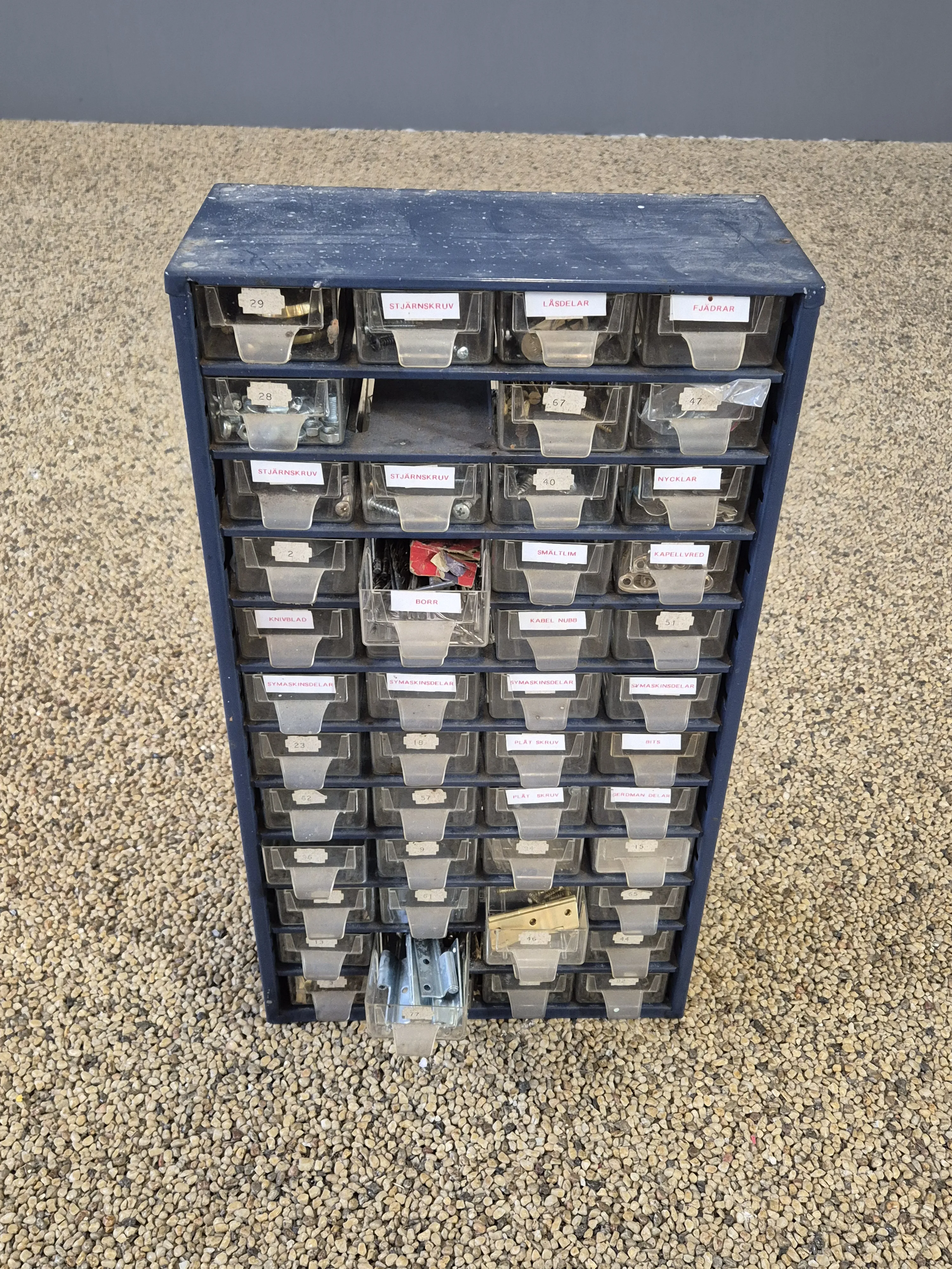 Med div innehåll, en låda saknas. Höjd:55 cm Bredd:31 cm