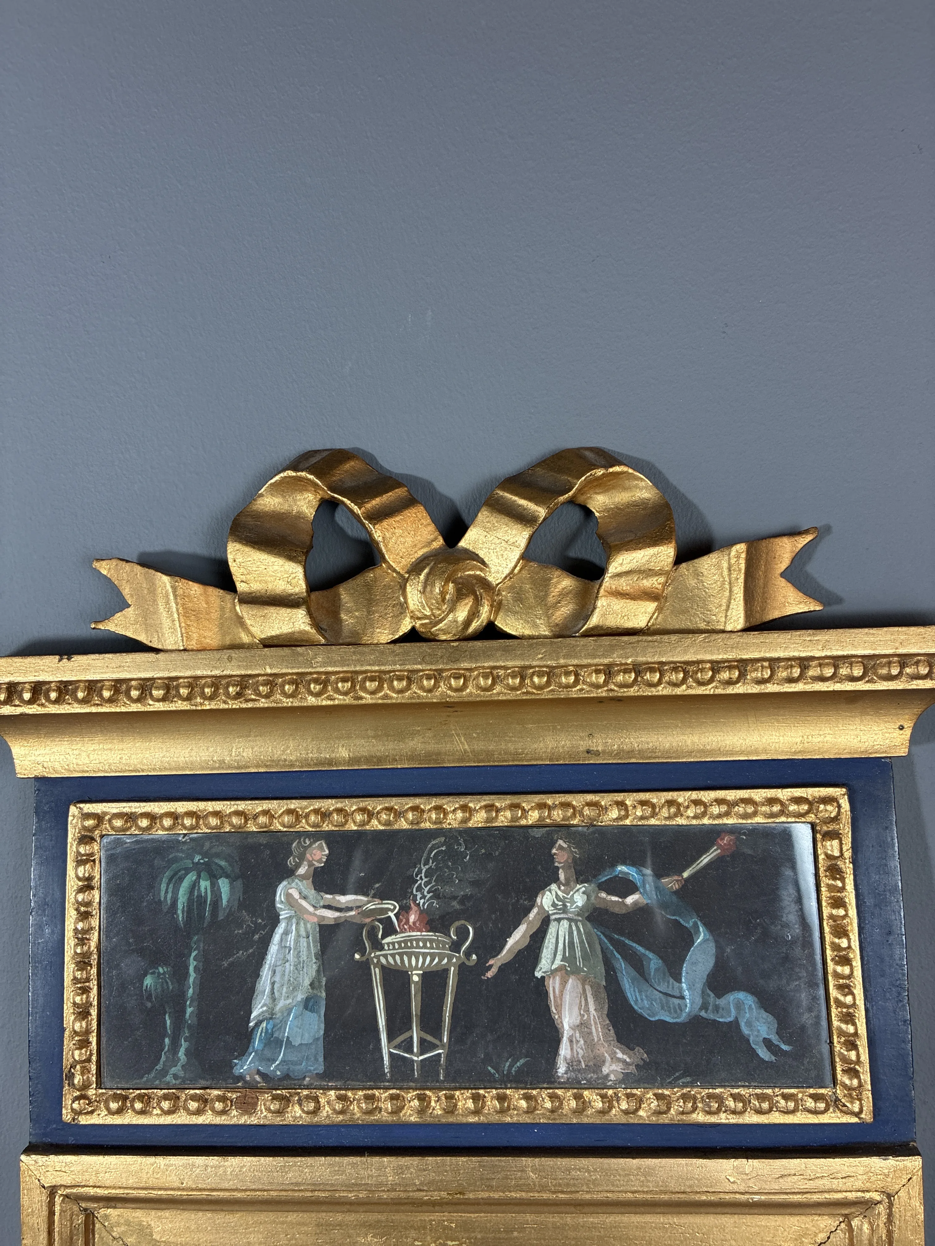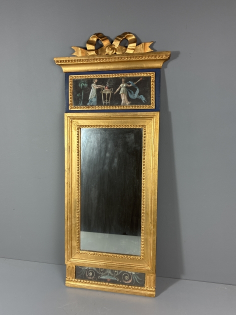Sengustaviansk spegel med dekorationer i gouache. Brännmärkt G Lindberg. Åldersslitage. 81cm x 35,5cm.