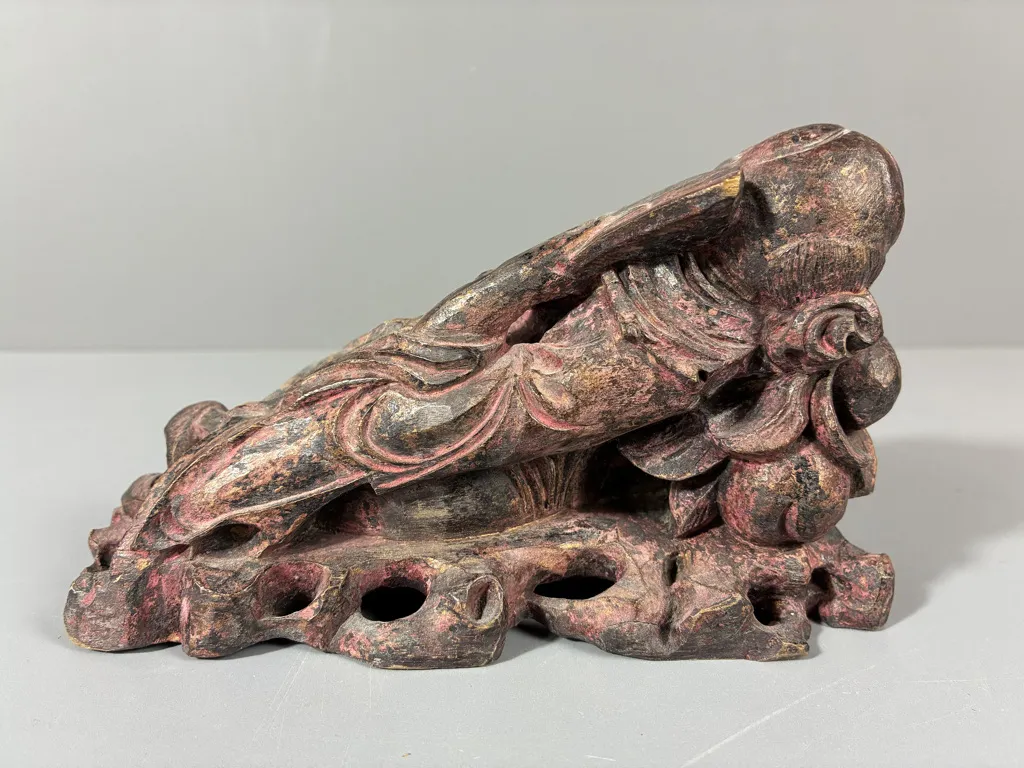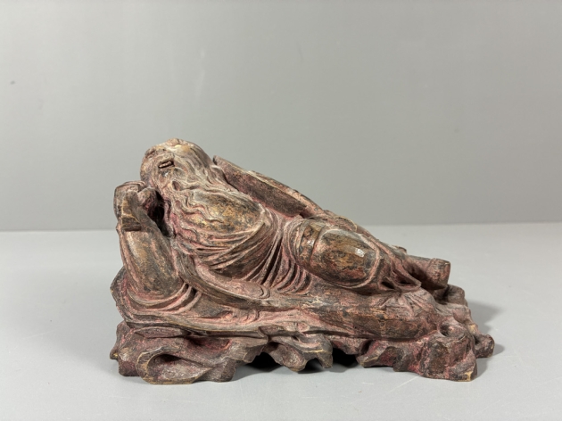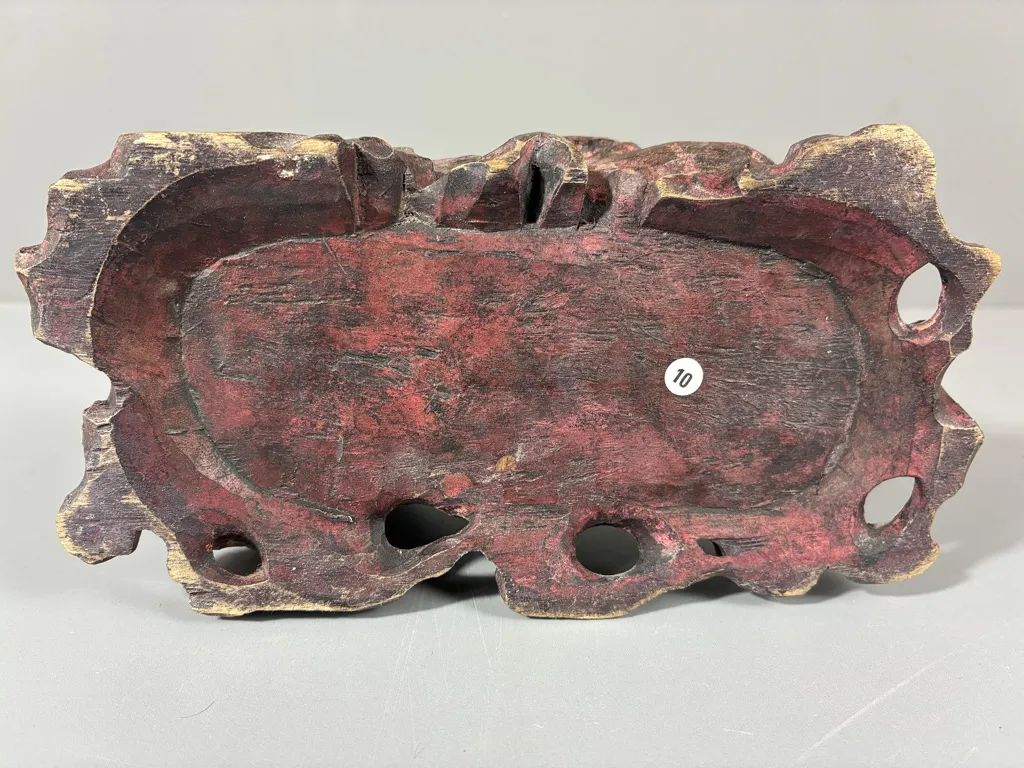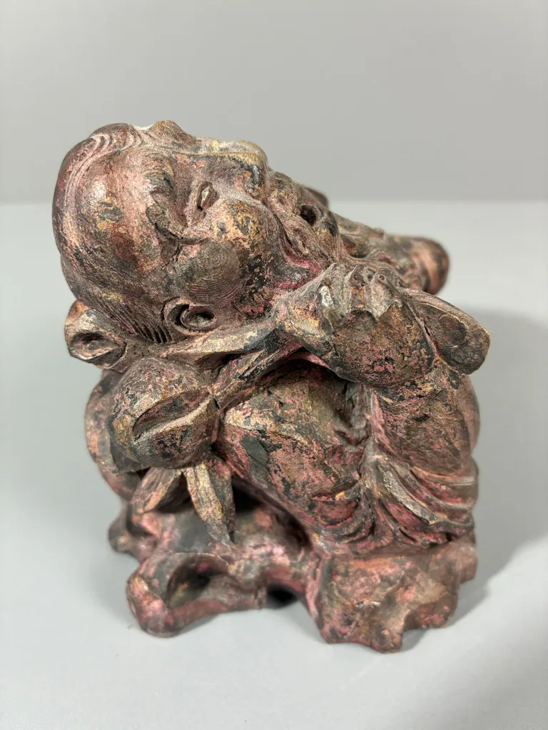 Asiatisk figur i snidat trä. Bredd:19cm Djup:10cm Höjd:11cm. Åldersslitage.