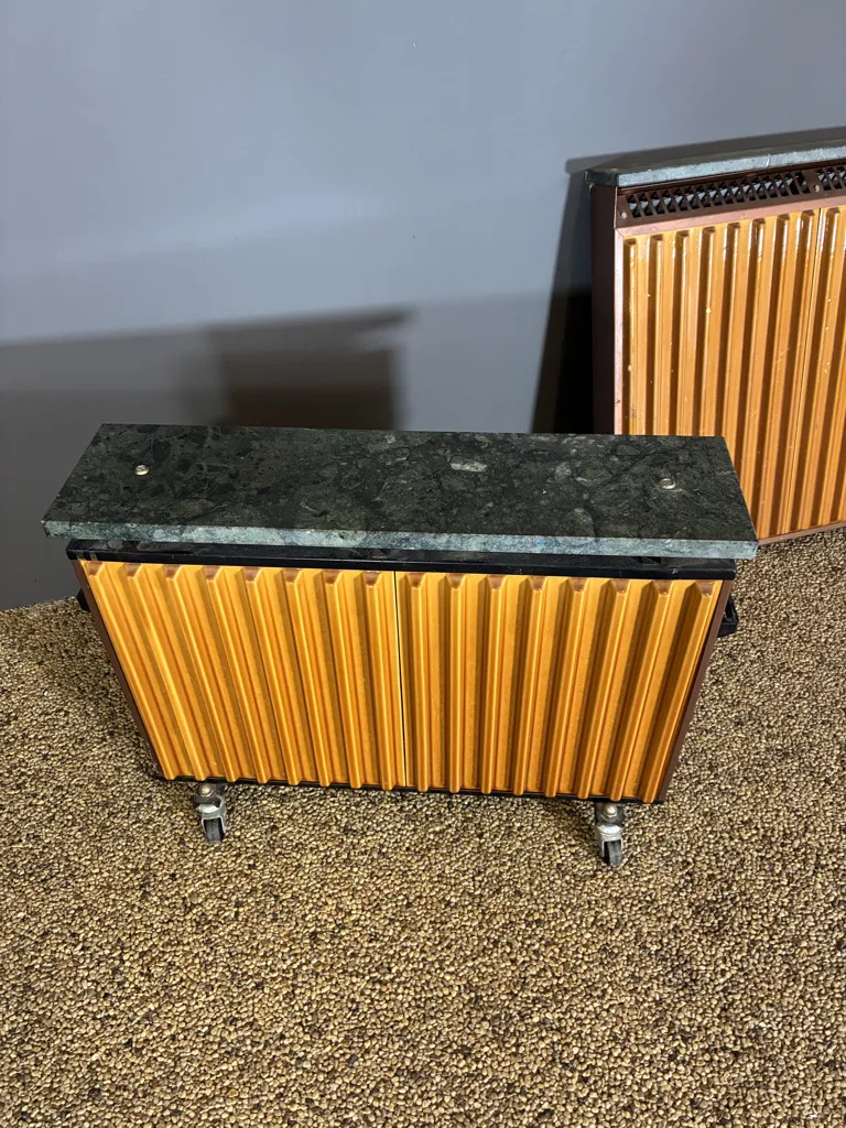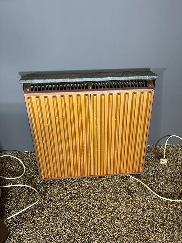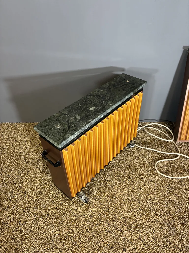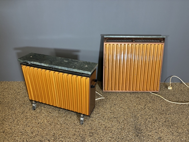 Två radiatorer med marmor platta samt klädda med lejongult kakel. En bordsmodell med hjul samt en för fäste på vägg. Åldersslitage.