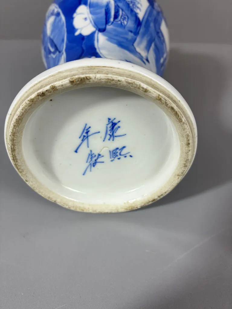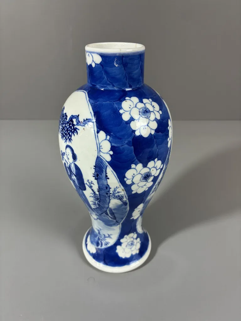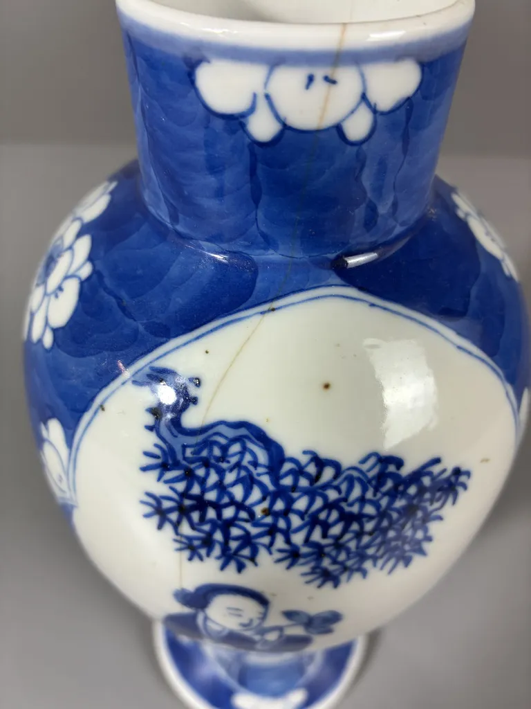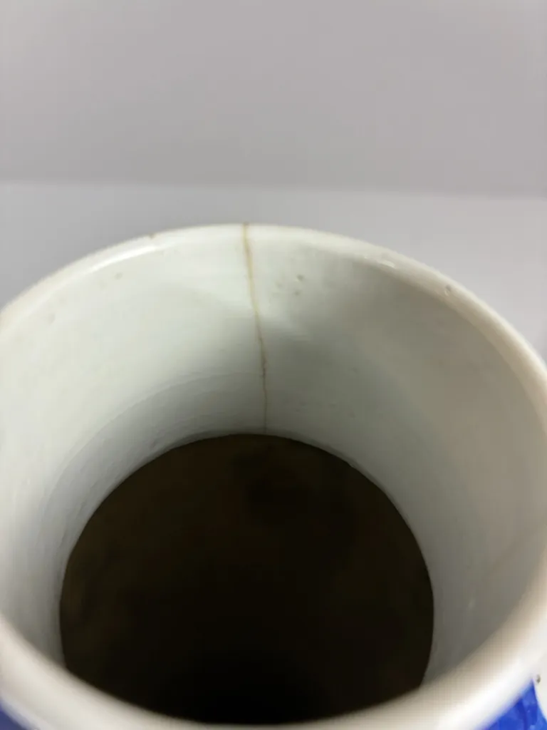 Porslin med blåmålad dekor. Spricka enl bilder. Höjd:26cm