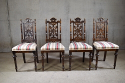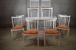 Bord: Höjd 75cm Bredd (exkl iläggsskivor) 135cm Djup 100cm. Stolar: Rygghöjd 83cm Sitthöjd 45cm. Slitage, skav och repor.